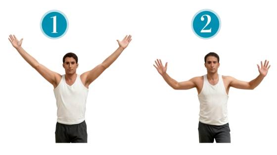 2. W 式:双臂呈“W”形,屈肘约 90 度,将手臂下放至腹部两侧,同时努力将肩胛骨向内靠拢。保持 2 次呼吸。