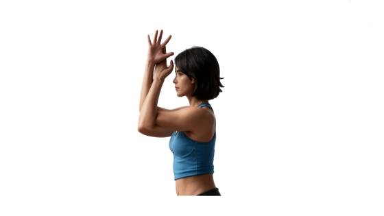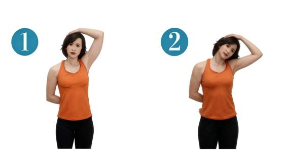 4. 利用置于头顶的手,轻柔地向下施加压力,以加深拉伸(请注意力度,避免过度拉扯)。