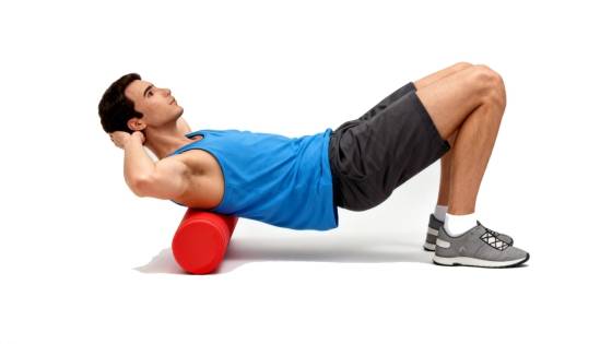 1. 仰卧,双手放在头后,将泡沫轴放置于上背部下方(避开颈部)。
