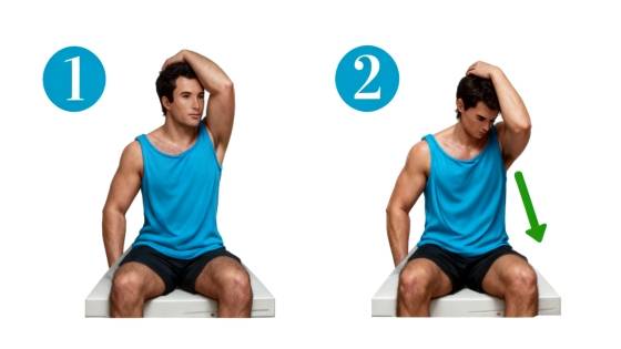 3. 此时,用左臂(或手)轻轻地将头部向下“引导”,让目光看向左侧腋窝的方向,直到感觉颈部右侧有轻微拉伸感。